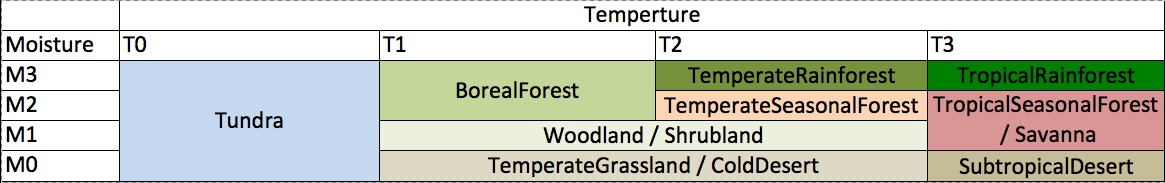 For each Voronoi cell, we could find its biome type with this table (Biome : Wikipedia):
