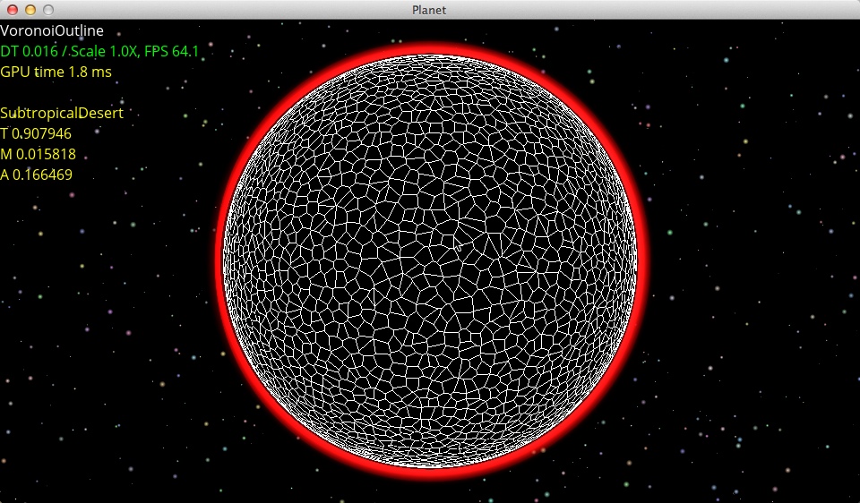 The first step of the map generation is to create polygons. If on a plane, we could use the Fortune’s algorithm, which creates the Voronoi diagram in O(n log n) time and O(n) space complexity. On spherical surface, we could use a similar approach, by sweeping the surface from the north pole to south pole. Although the data structure and mathematics is more complicated, the entire algorithm is not that difficult as the first instinct. Since the spherical surface is within a closed space, there are less edge conditions to deal with.